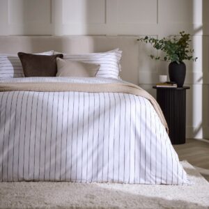 Indulge your sense of style with the white and grey striped Malmo duvet cover set. Unquestionable style for your bedroom interiorFall asleep in the luxurious comfort of our 180-thread-count premium cotton Malmo duvet cover set. This stunning set features a crisp white background with subtle soft grey stripes, creating a chic and elegant finish that complements…