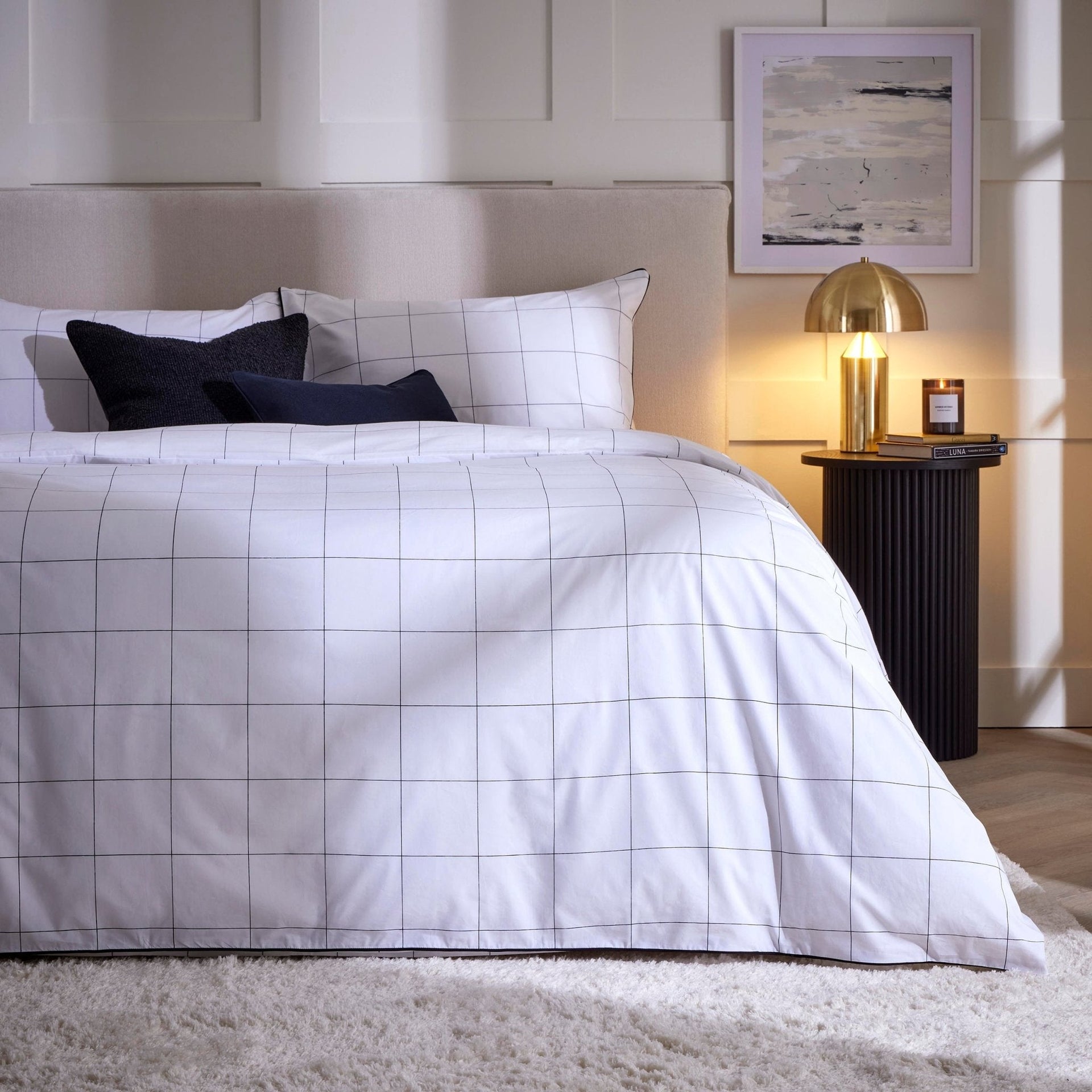 Our Bergen check print duvet cover set brings a smart and stylish touch to your bedroom decor.Lasting luxury for your sleeping spaceMade from luxuriously soft 200-thread-count premium cotton fabric for a dreamy night’s sleep, the Bergen duvet cover set features a large fine check print pattern against a crisp white background. It also has subtle black piping around the edges, creating an elegant and stylish contrast. With a look and feel to suit any classic or contemporary bedroom interior, it’s the perfect addition to your sleeping space. The Bergen duvet cover set comes complete with classic pillowcases.Available in the following sizes: Single (includes 1 x pillowcase)Double (includes 2 x pillowcases)King (includes 2 x pillowcases)Super King (includes 2 x pillowcases)