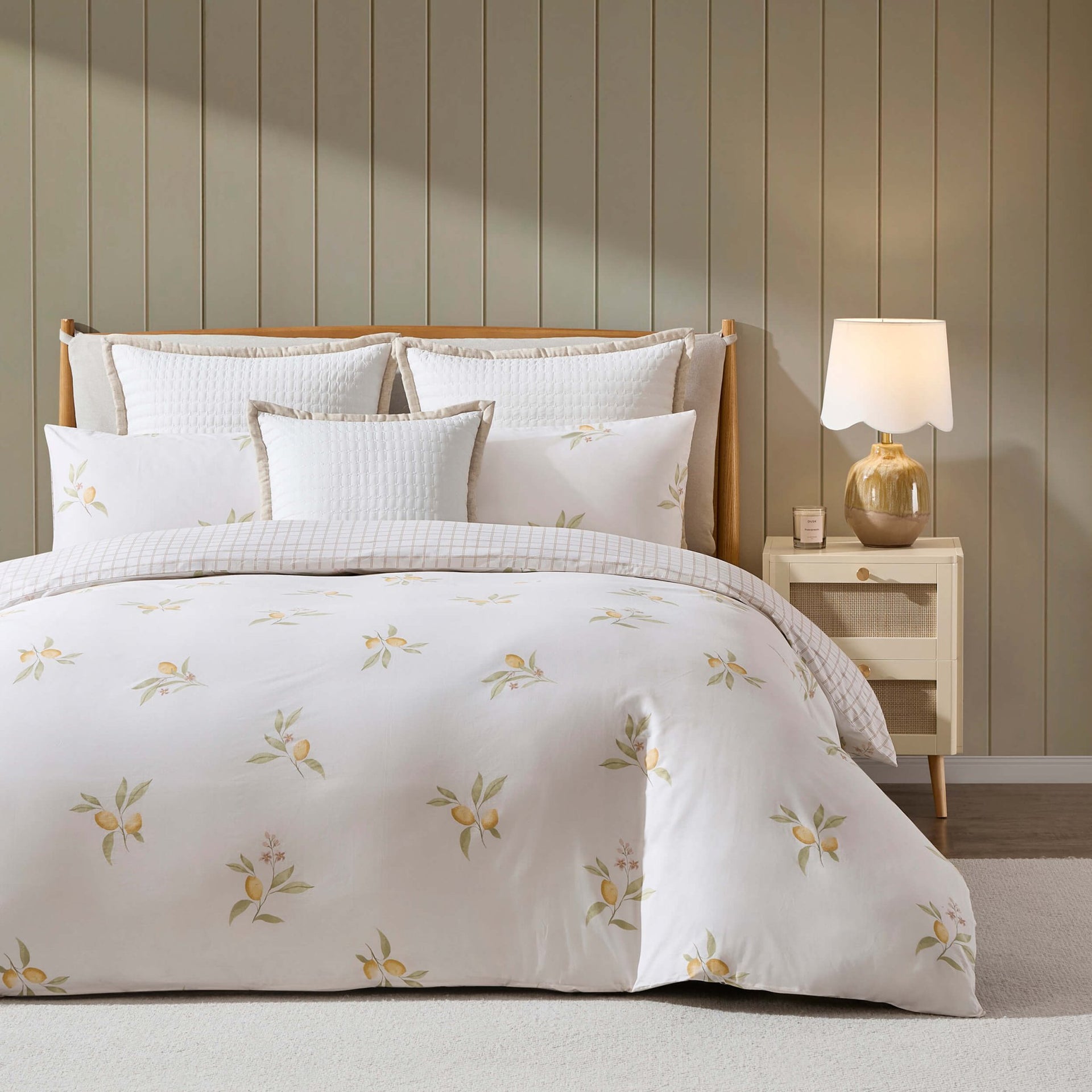 Lucie brings a zest for life to your bedroom with its fresh design.A citrus-inspired escape, crafted in soft cottonBursting with charm, this duvet cover set is adorned with delicate lemon motifs, bringing a hint of Mediterranean warmth to your space. Made from 180TC percale cotton, it’s lightweight, breathable, and effortlessly soft – perfect for dreamy nights all year round.Designed with versatility in mind, Lucie features a classic checked reverse, giving you the option to switch up your look. Whether you’re creating a cosy retreat or a bright, airy space, this set delivers a laid-back yet elegant finish. Available in Double, King, and Super King sizes.